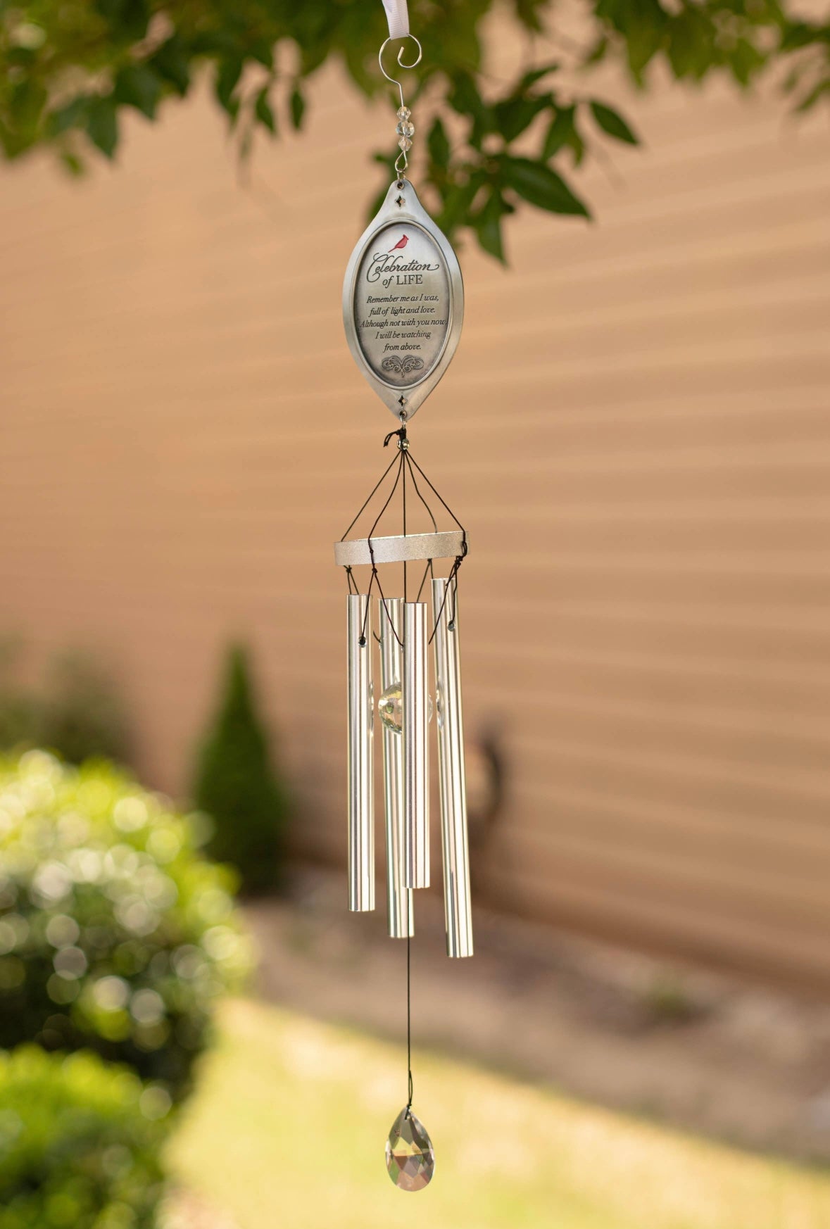 Measuring 19 inches, this stunning piece features Teri Harrison’s “Celebration of Life” poem engraved on both sides of the metal chime top—offering gentle words of comfort that endure with every breeze.