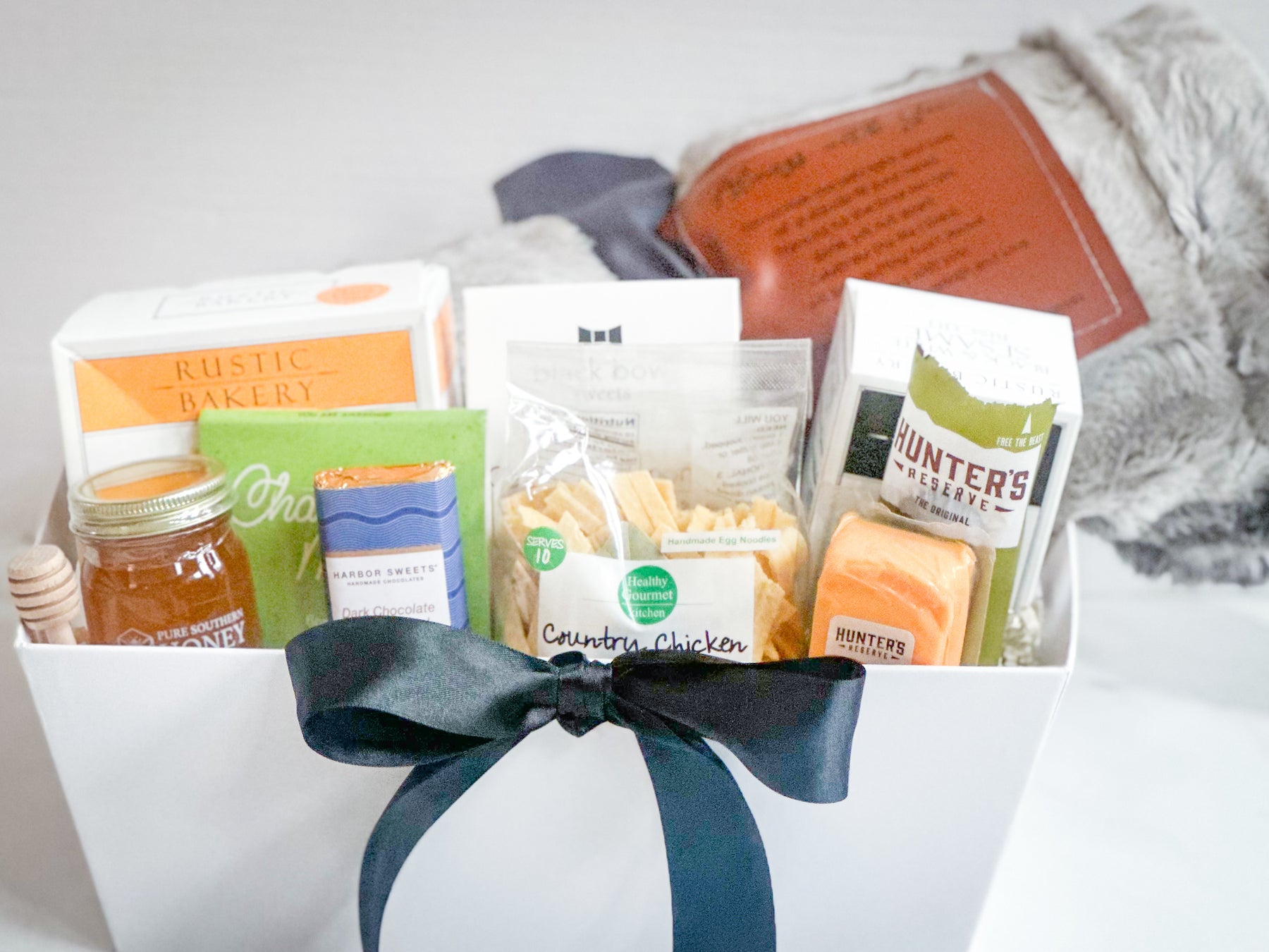 Includes artisan sausage, cheddar cheese, cheese coins, buttery biscuits, candied almonds, and chocolate — a thoughtful selection for quiet moments of self-care.