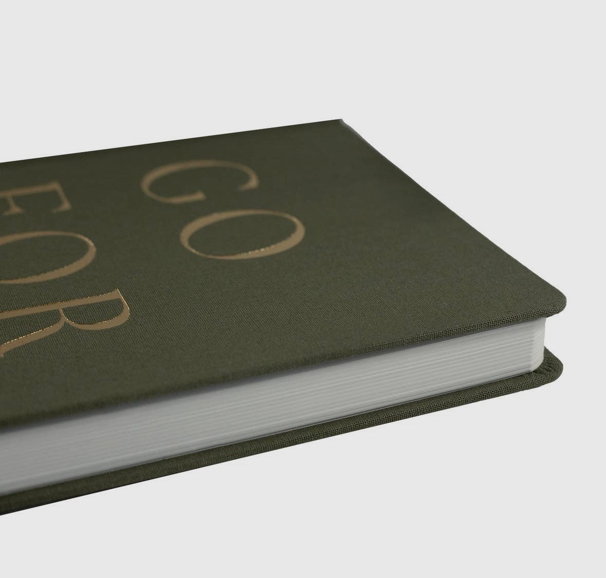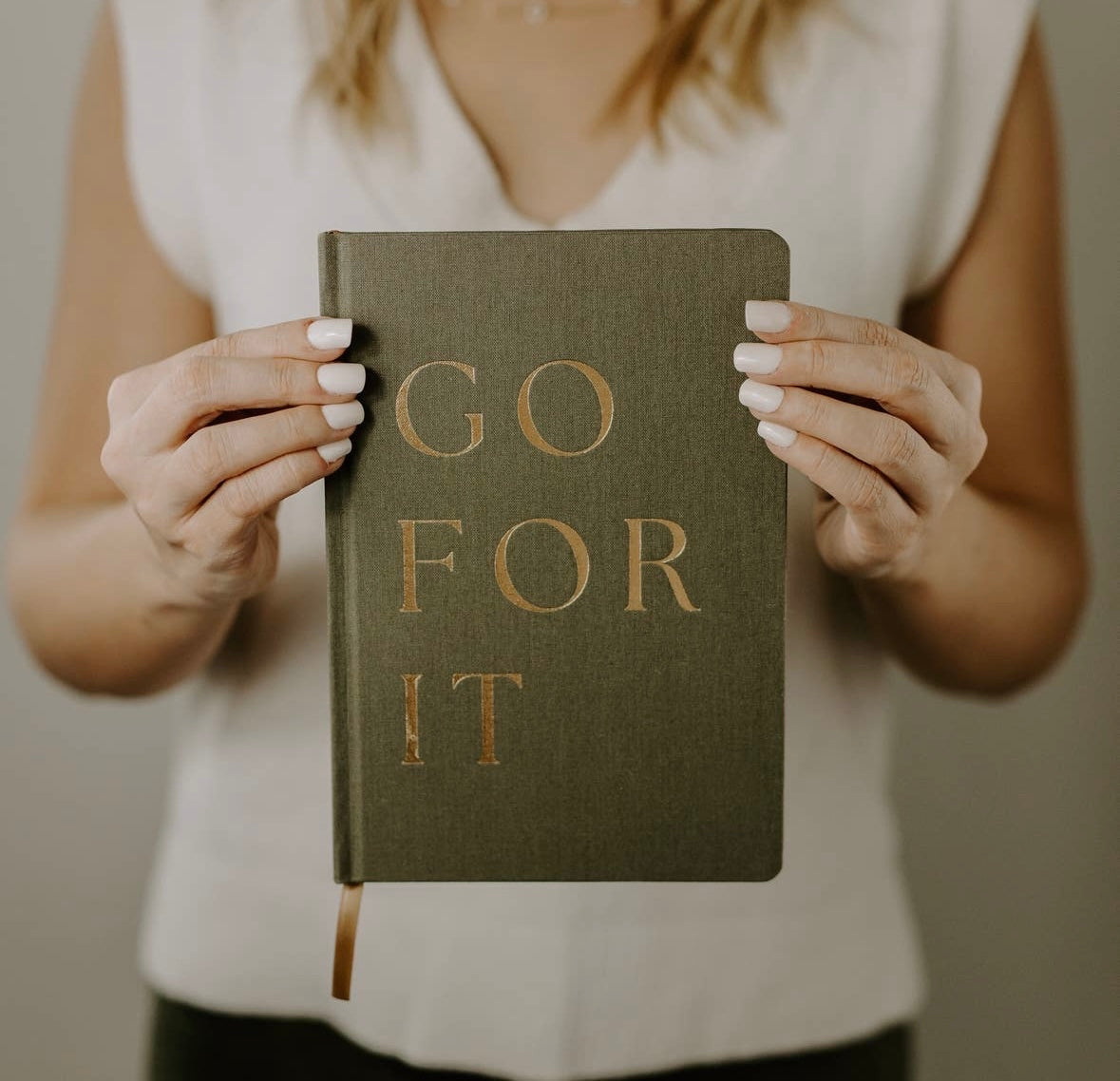 Our Go For It olive green and gold fabric journal is a chic, stylish, and easy to write on notebook. There&