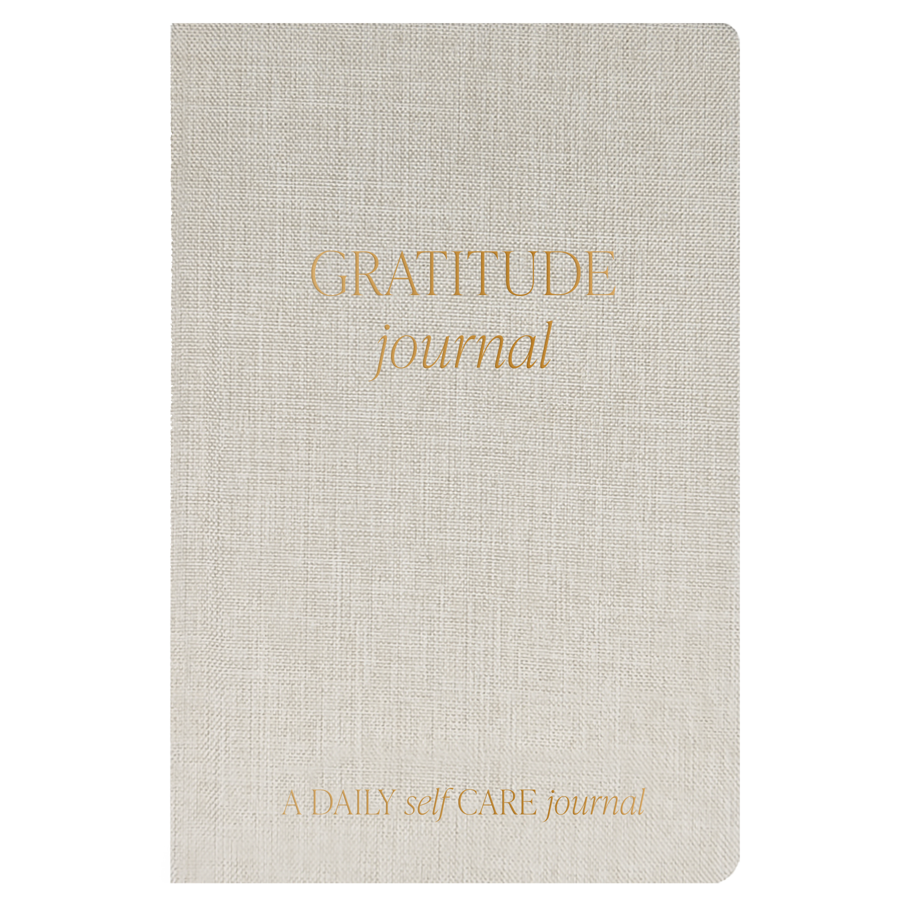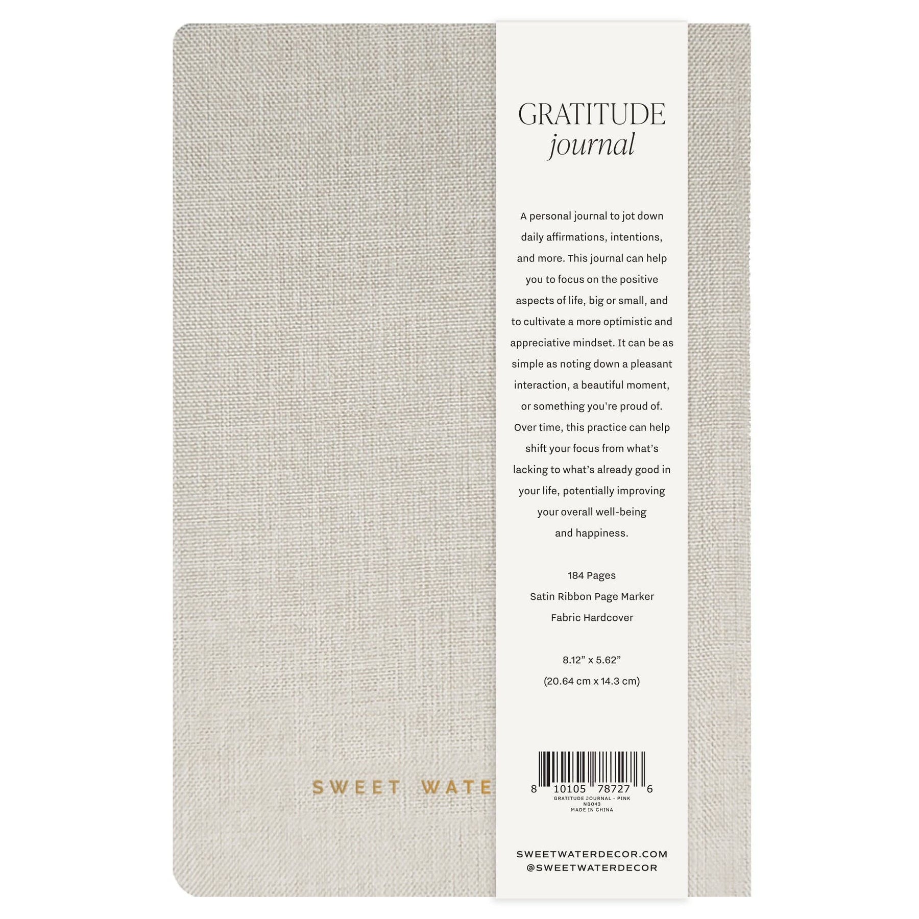 DETAILS: • Size: 5.75" x 8.25" x .65" • Design: Gratitude Journal (with prompts) • Tan Fabric Journal with Gold Foil Details • 100gsm Uncoated Lined Paper • Satin Ribbon Bookmark • 184 pages front and back - 1 Year of Prompts • Designed in the USA, Imported • Style No. NB043