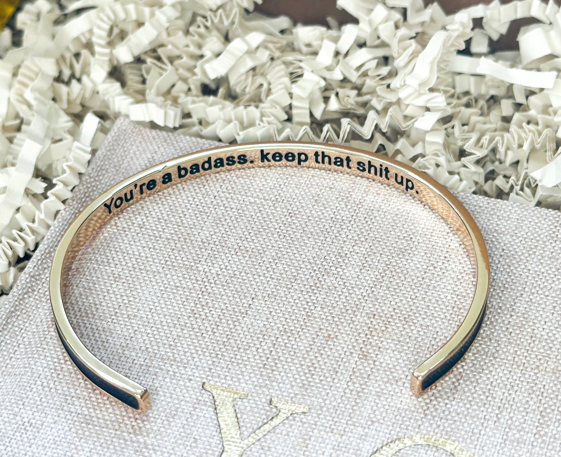This thoughtfully crafted gift set includes a 'You Got This' fabric journal along with an Inspirational Metal Pen Set. A “you’re a badass. keep that shit up” enamel bangle bracelet, hidden from sight but close by as a constant reminder. You’ll also find decadent salted caramel almond chocolate chip cookies and luxurious organic dark chocolate.