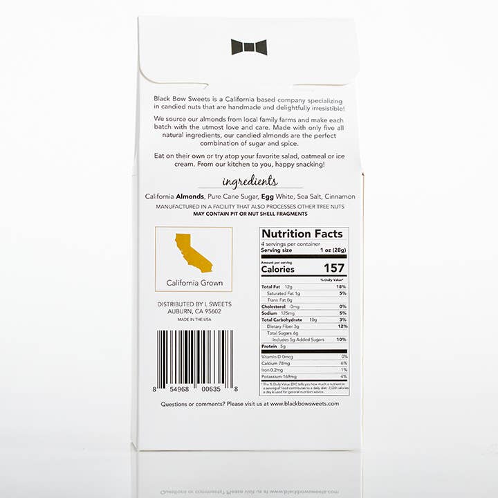 keywords: Candied, Candied Nuts, Candied Almonds, Gourmet Nuts, Gourmet Almonds, Handmade, Artisan, Small Batch, California, California Grown, Made in the USA, Woman Owned, Tasting Room, Winery, Snack, Mini Bar, Hotel, Black and White, Black, White, Gold