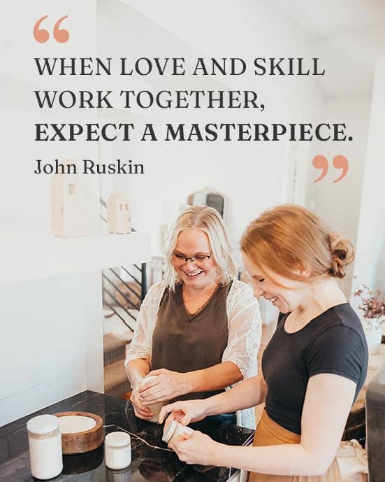 Two women working together in a kitchen with a quote by John Ruskin.