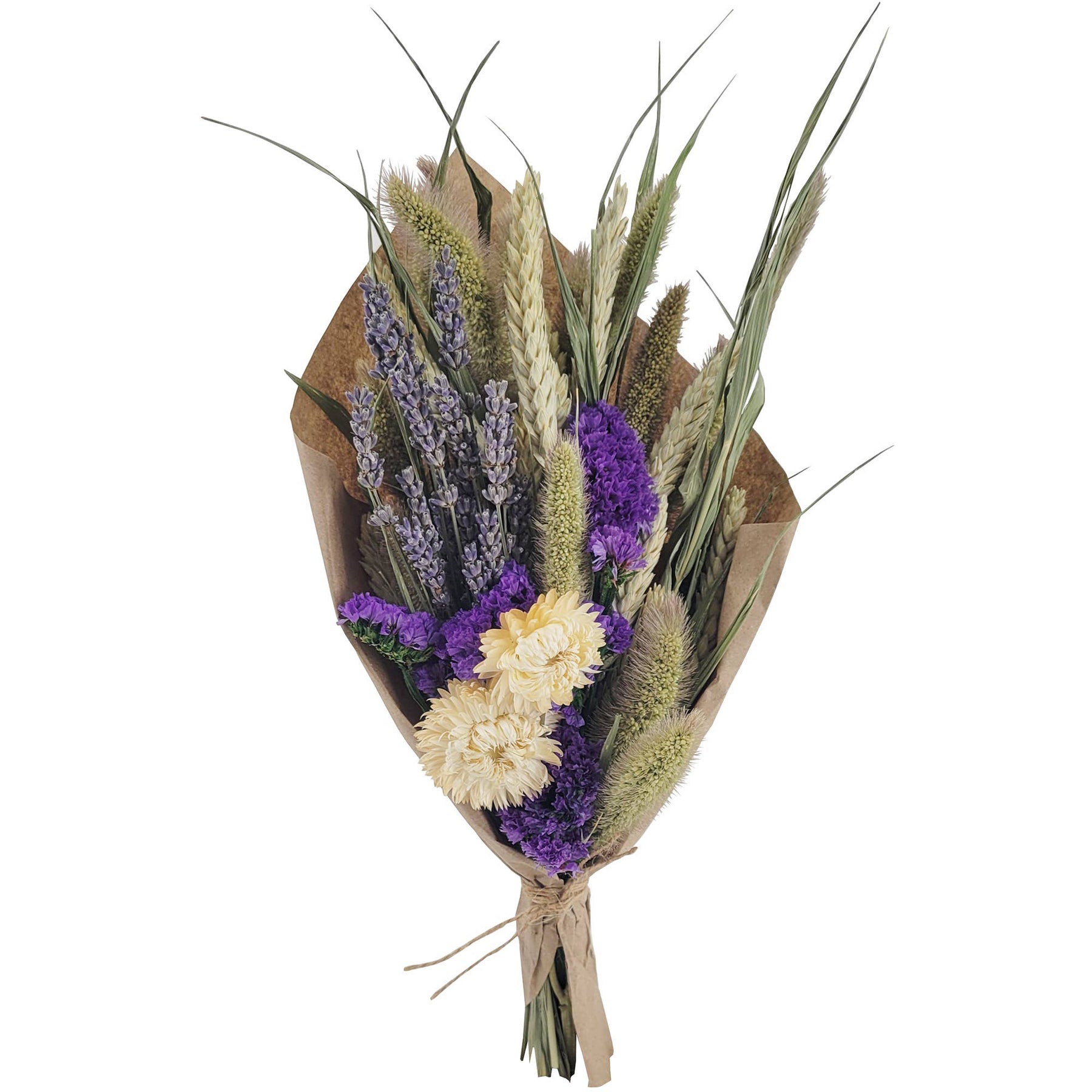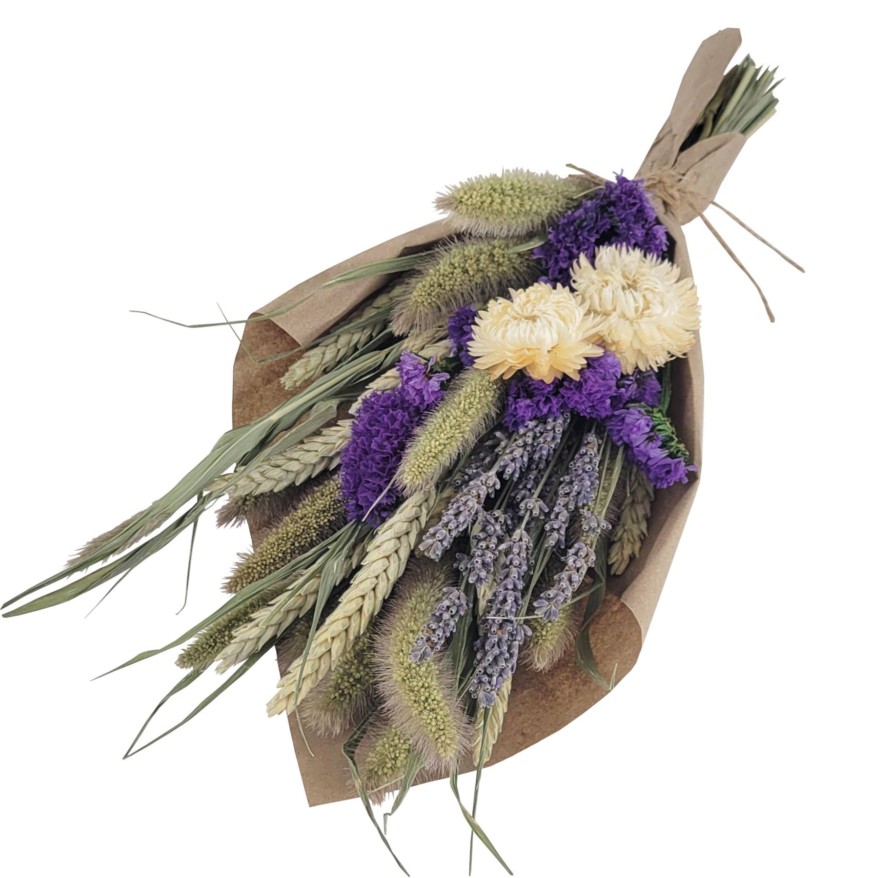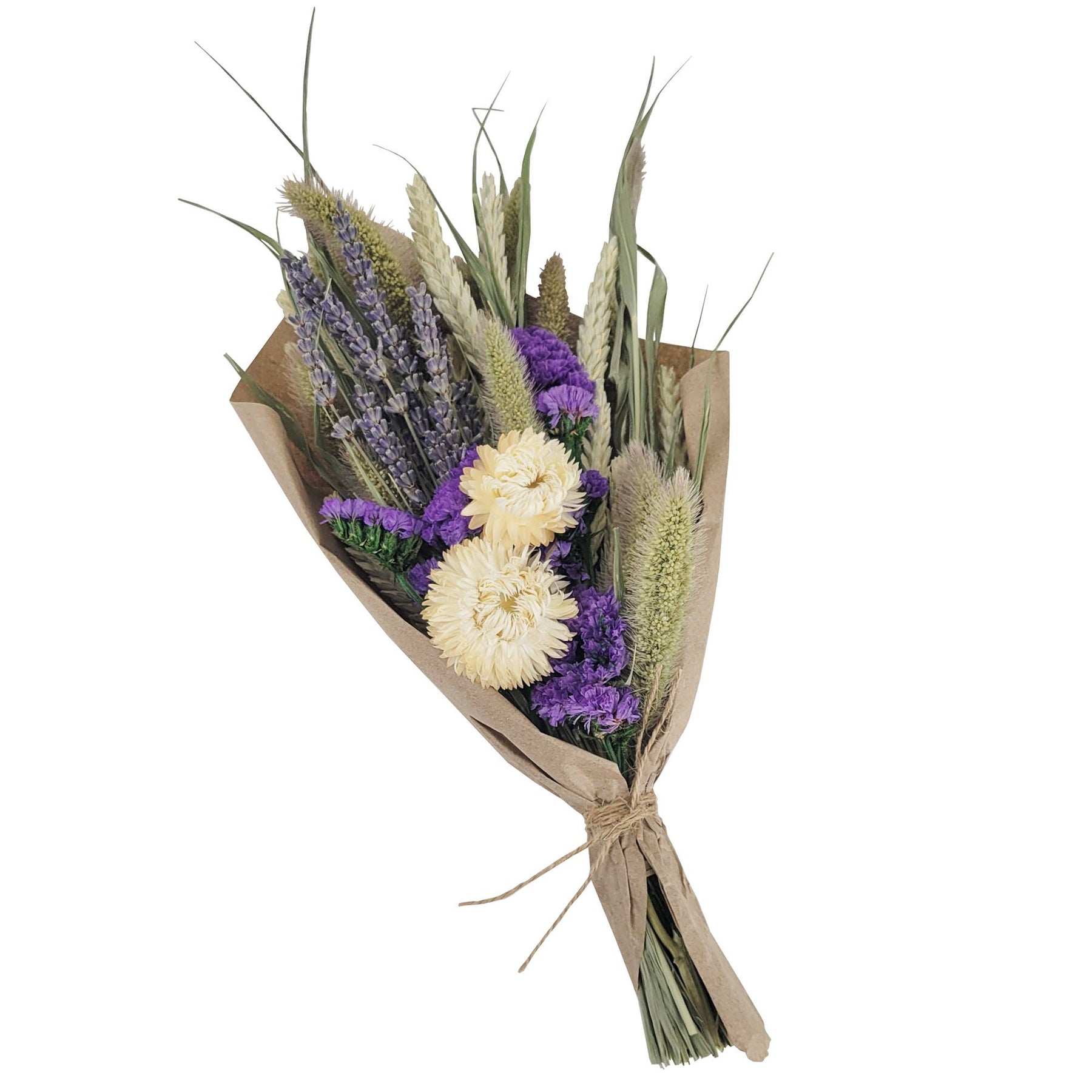 Our floral team designed this delicate & petite size bouquet using a mix of natural strawflowers, lavender, and grains to create this farmhouse bouquet look. Each bouquet is designed and handcrafted in our California design studio. - 12" long