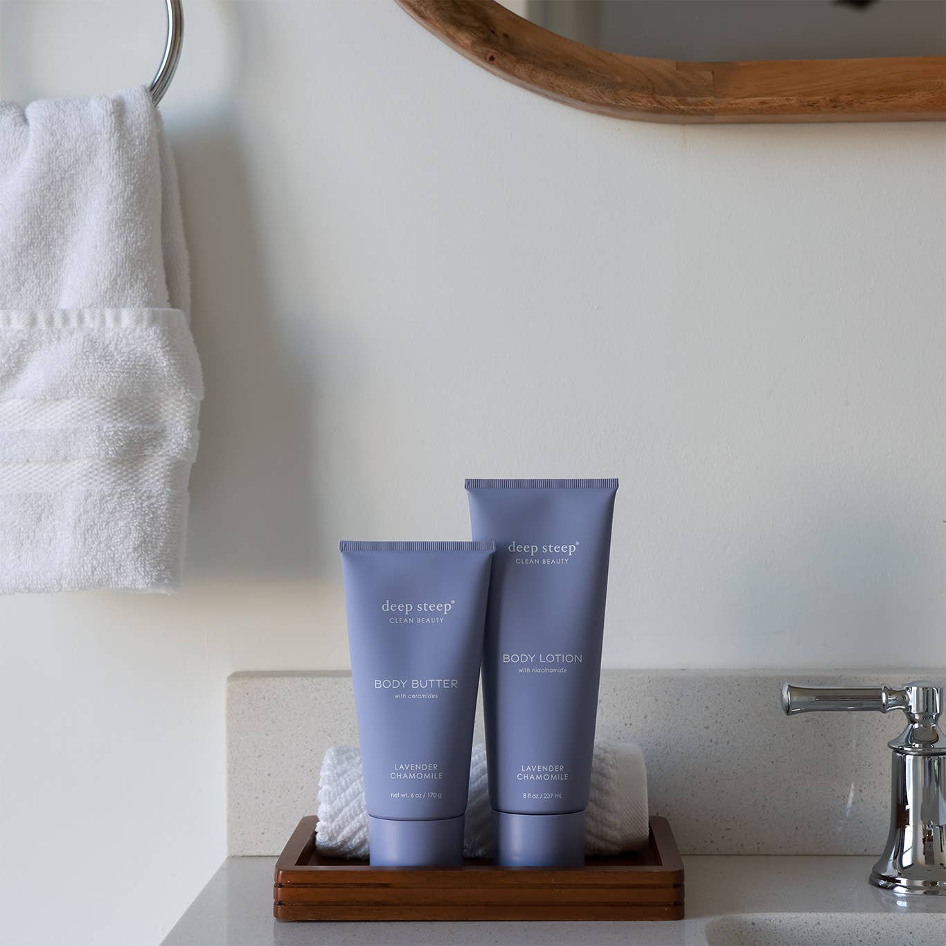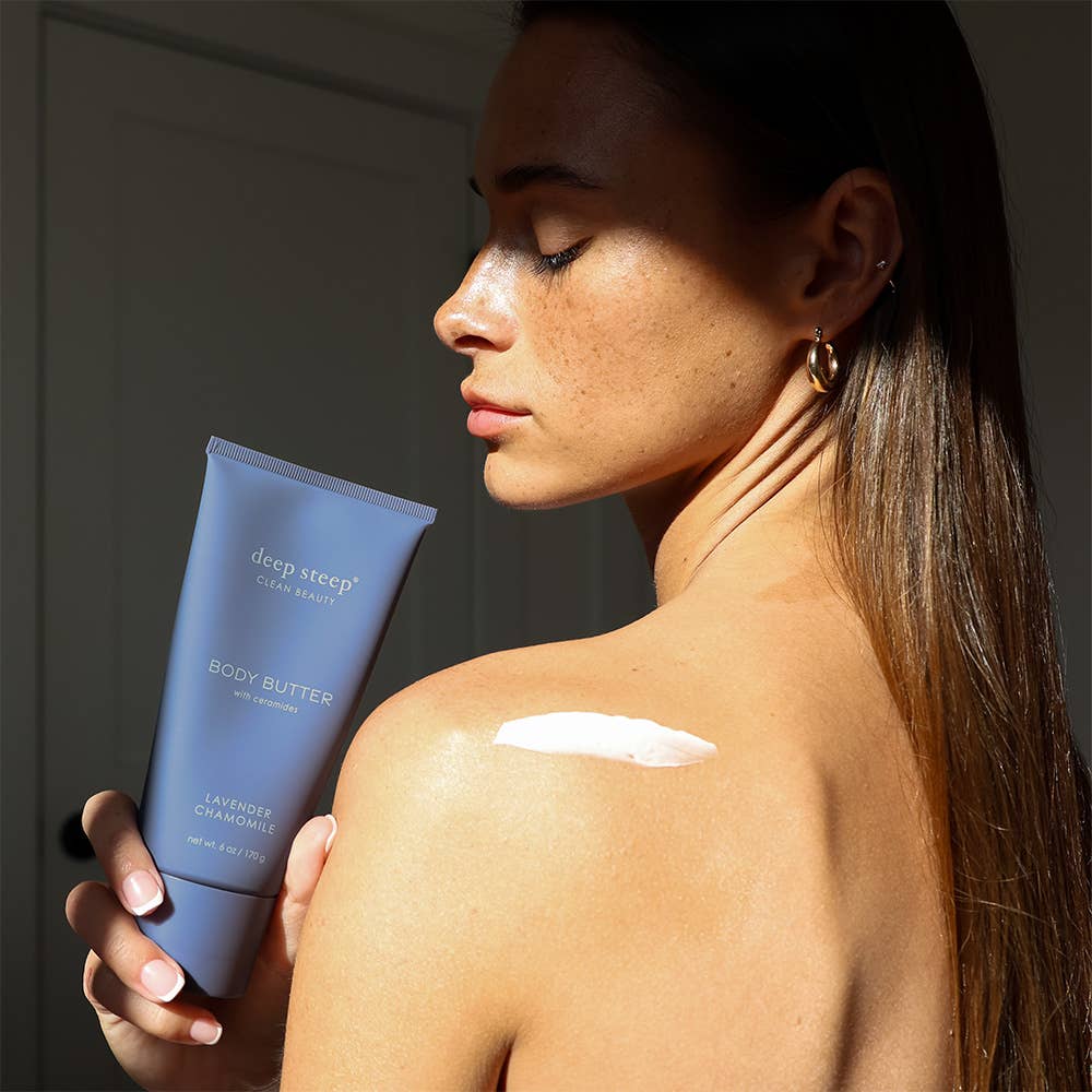 Lavender Chamomile - Soothing Bulgarian Lavender, calming Chamomile with hints of citrus creates peaceful perfection. A 100% aromatherapy essential oil blend. This aromatic body moisturizer provides lightweight, velvety soft texture for long-lasting nourishment and ultimate hydration. Fast absorbing, non-greasy, non-tacky, buttery perfection. Step up to visibly softer and smoother skin.