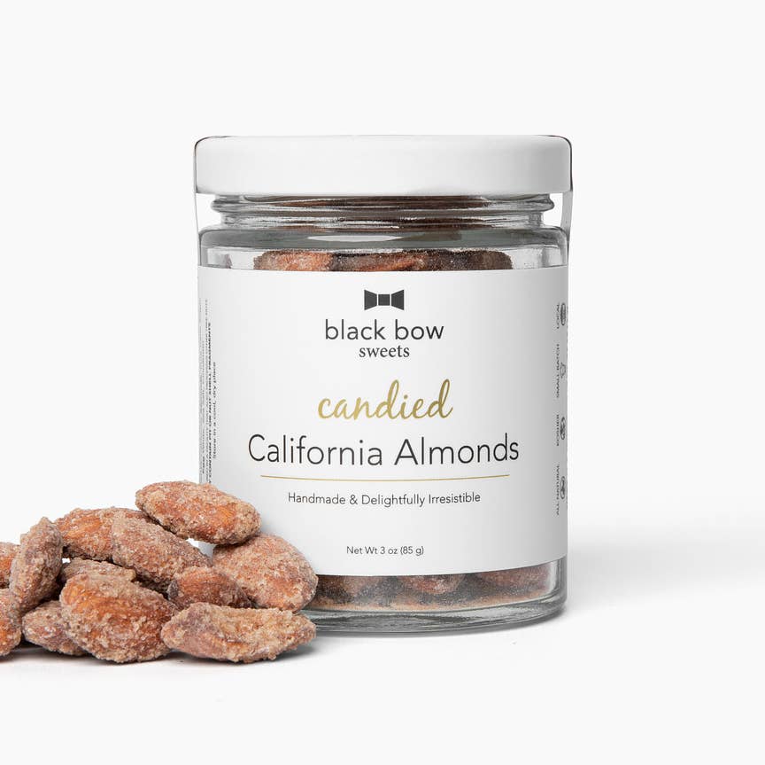 Our Candied California Almonds are handmade with locally sourced California almonds and baked to perfection with a blend of cinnamon, sugar and hint of sea salt. These almonds are crunchy with a subtle sweetness making them a delightfully irresistible snack! Our glass jars are an elevated addition to our packaging line up. The modern black and white design with gold accents and custom bow seal is attractive on its own or as part of a gift set.