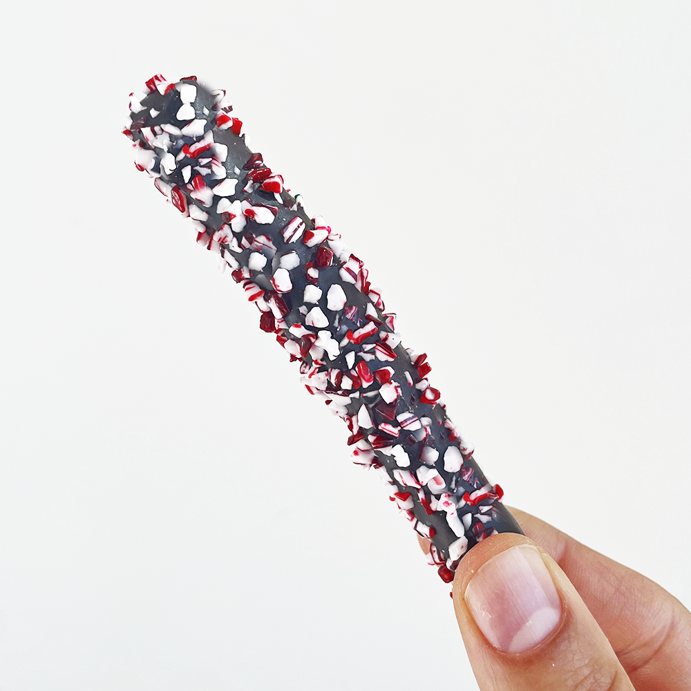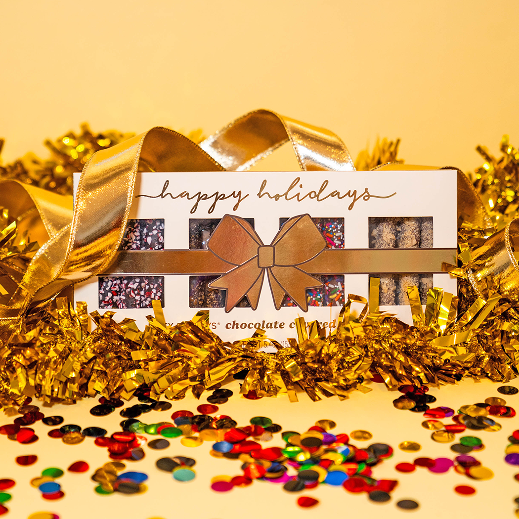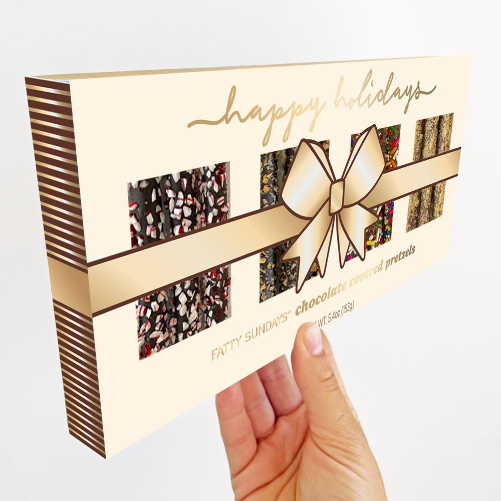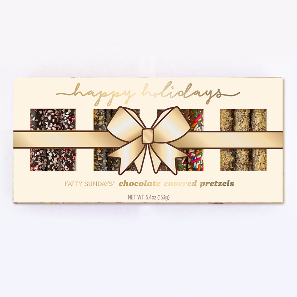 Our Happy Holidays gift box is so many things... but most importantly, it's filled with drool-worthy chocolate covered pretzels AND packaged in a one-of-a-kind custom designed gold foil sleeve. Its beauty and elegance will wow recipients all season long. Best-selling flavors included: Peppermint, Salted Caramel, Sprinkles and Toffee. 3 pretzel rods per flavor, 12 pretzels per set. Each pretzel rod is approx 4" long. Certified Kosher. Shelf life: 9 months.