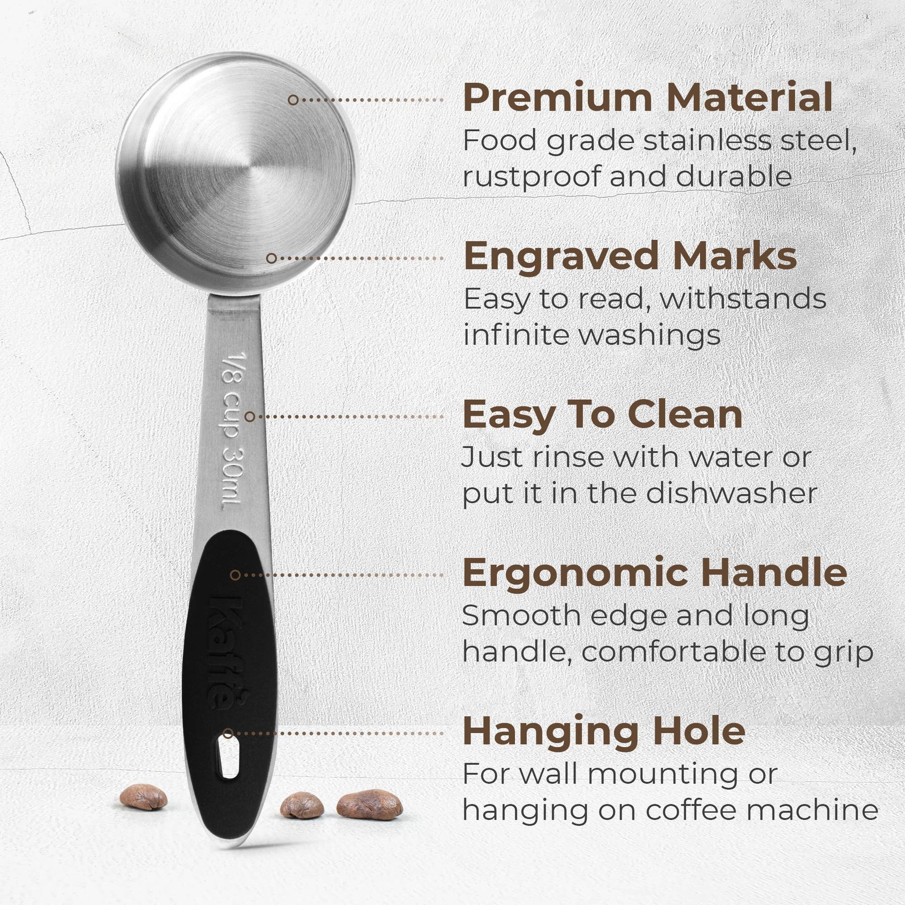 ☕ PERMANENT ENGRAVED MEASURING MARKS - Featuring 3D engraved measurements of 1/8 cups and 30ml, our coffee measuring spoon ensures lasting precision without fading.