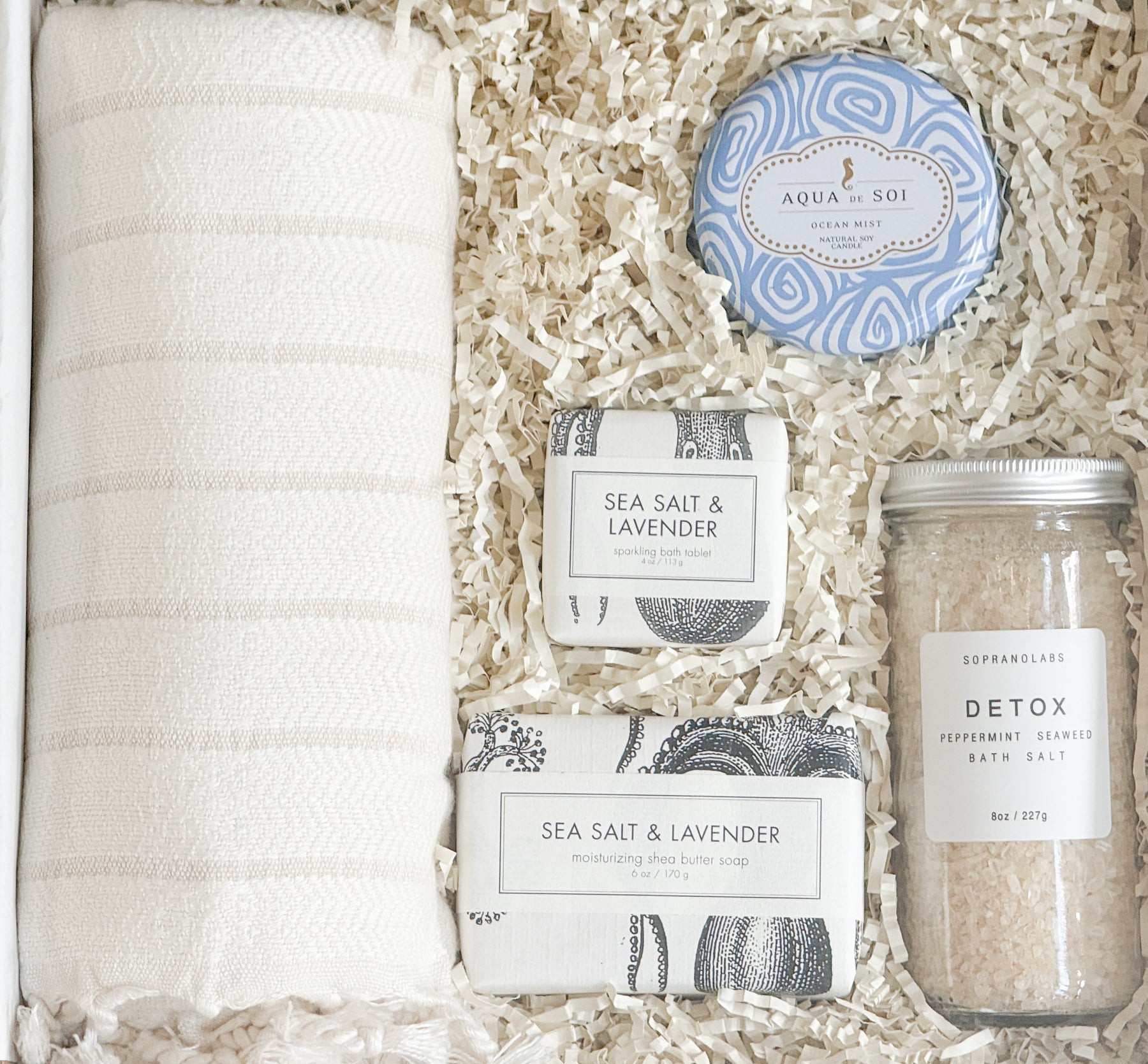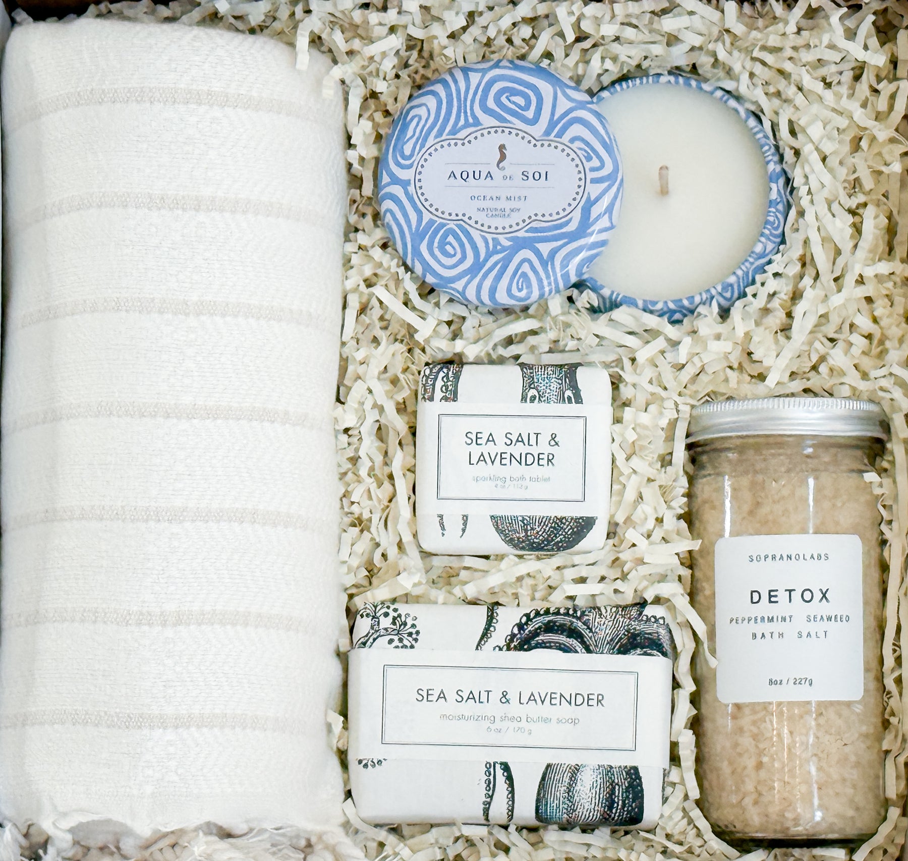 Bring the calming essence of the coast home with the Seaside Serenity Spa Gift Box from Curated Comforts Co.
